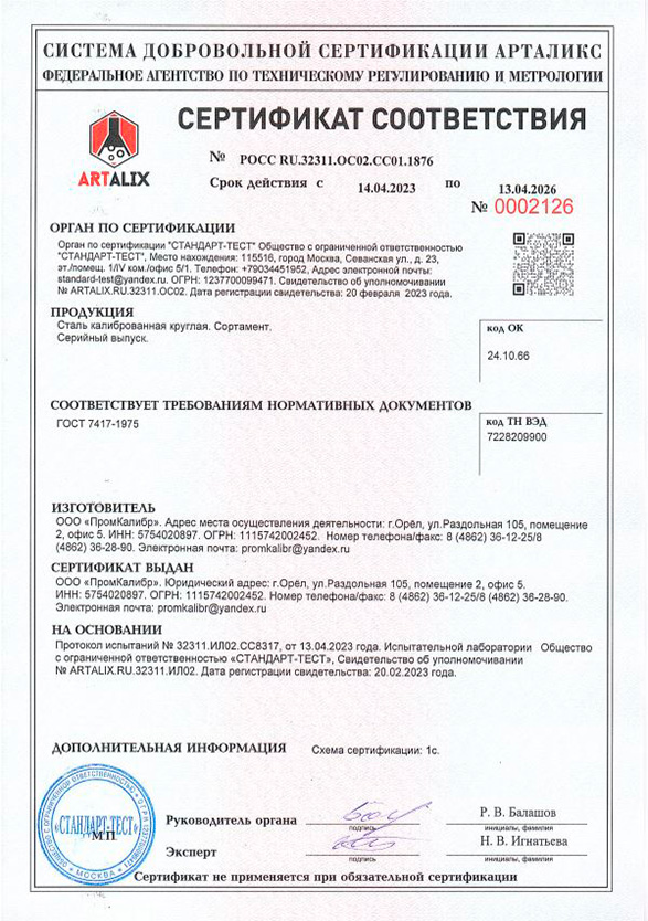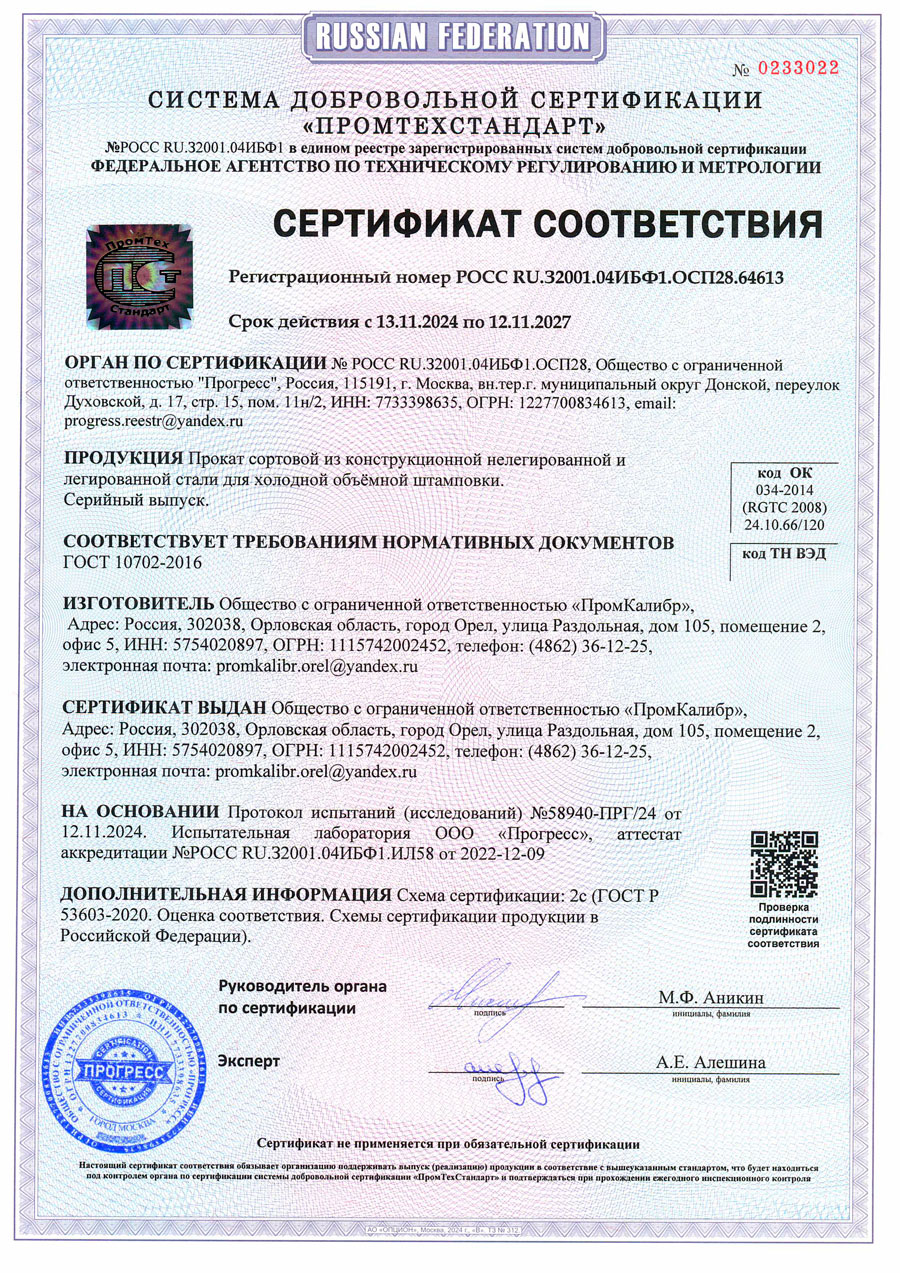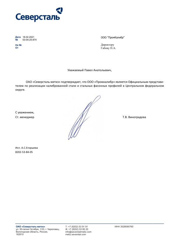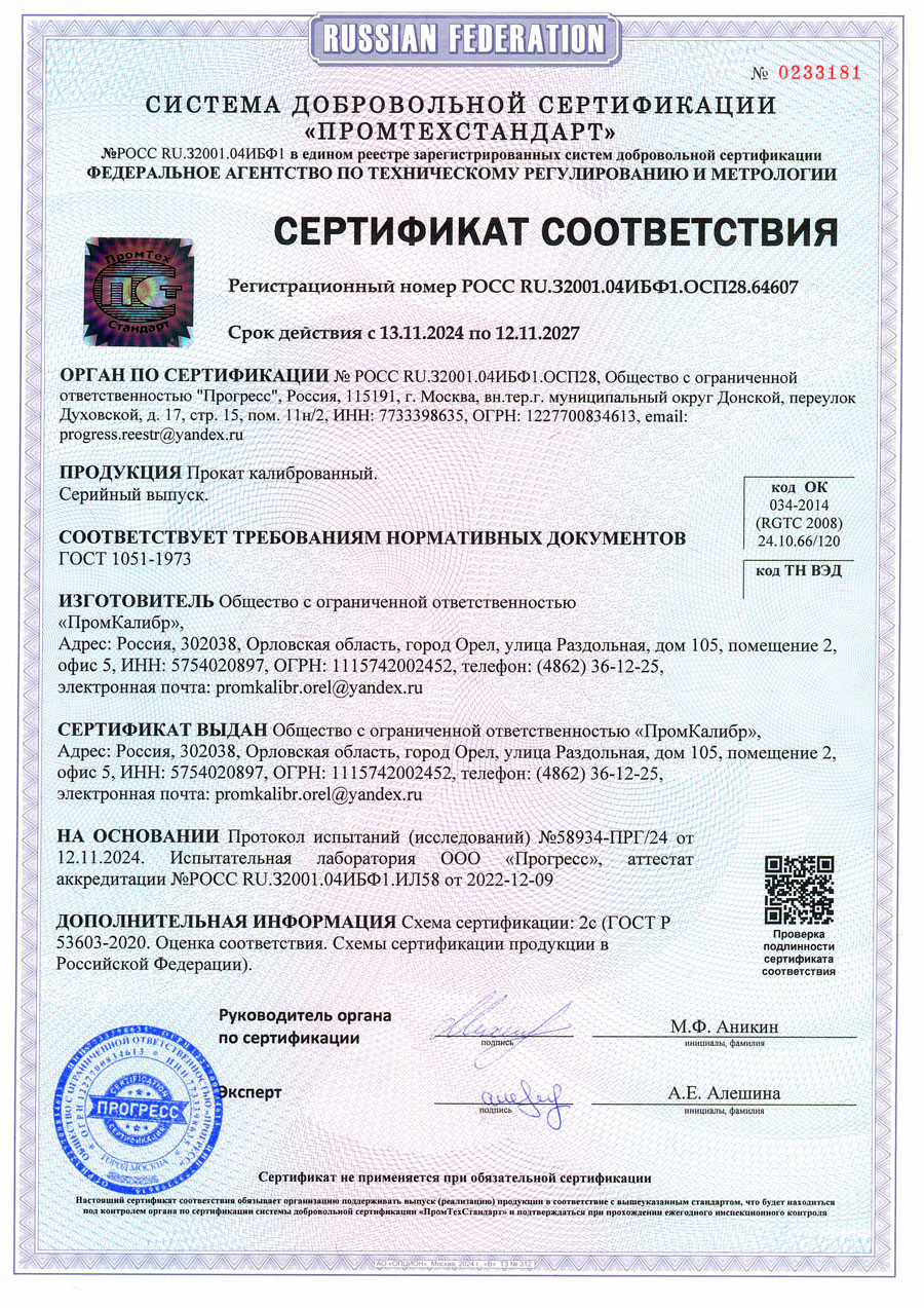 Компания ООО «ПромКалибр» является официальным представителем ОАО «Северсталь-метиз» по реализации калиброванной стали и стальных фасонных профилей в Центральном федеральном округе. Мы успешно занимаемся продажей металла с 2001 года. Основным видом поставляемой продукции является калиброванный металлопрокат производства ОАО «Северсталь-Метиз» в Орле. На складе готовой продукции только в постоянном наличии имеется более 1000 тонн калиброванного проката. Все типоразмеры металлопроката и три вида сечения: круг, шестигранник, квадрат калиброванный.